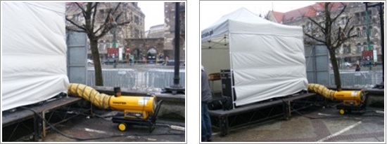 Температура воздуха во время концерта колебалась от 0 до 5 °C. На открытой сцене температура при помощи нагревателей поддерживалась на уровне 10 °C. Напротив сцены находилась техническая палатка площадью около 6 м². Обогрев палатки осуществлялся при помощи жидкотопливного нагревателя Master непрямого нагрева меньшей мощности — Master BV 77 мощностью 20 кВт, который также располагался за палаткой, а теплый воздух подавался посредством гибкого шланга. |
