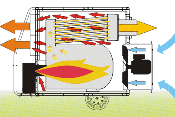 Вентилятор создает мощный воздушный поток, который нагревается, проходя вокруг камеры сгорания и через теплообменник.